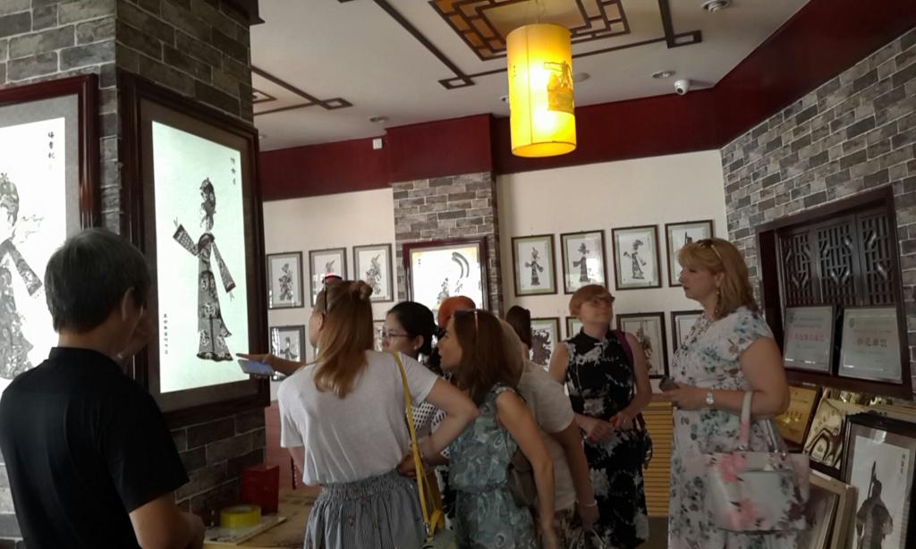 7月6日,莫斯科艺术学院8名教师,在渭南师范学院相关领导陪同下,来到华州宏权影艺文化传承发展有限公司考察华州皮影。他们参观华州皮影精品展览,观看影子坊皮影制作全程,听取公司总经理薛宏权进行皮影文化艺术讲述,翻译员两面沟通、尽心翻译,最后观看宏权创新皮影团演出的皮影芭蕾舞剧《喜儿》,现代剧《丝路风》、《杰克逊跳街舞》等。