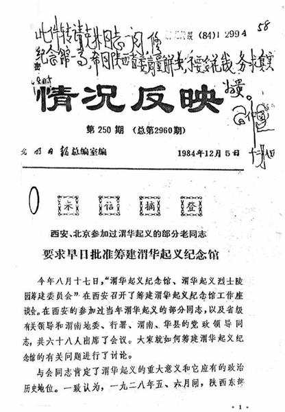 1984年12月,习仲勋同志为修建渭华起义纪念馆作批示