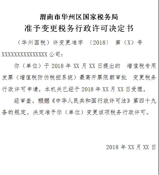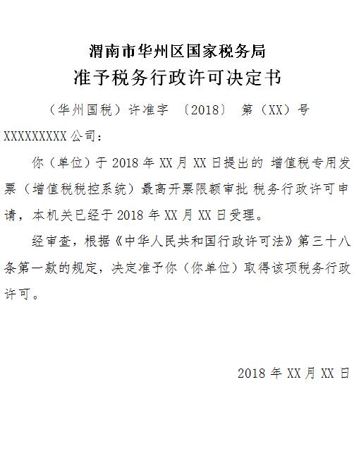 决定准予你(单位)取得增值税防伪税控系统最高开票限额X万元的税务行政许可。